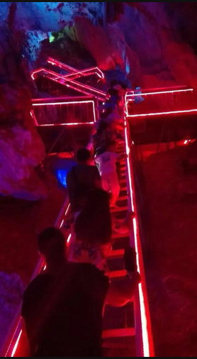 在攀150米的天梯時,好幾個女同事手心都冒汗了,只能緊緊抓住欄桿,就這樣還怕手滑。越是擔(dān)心,就越是緊張,越是緊張,就更不敢向下看了。還好,在其他同事的鼓勵與幫助下,大家克服心理障礙,勇敢地走過了這一程,就這樣在心驚膽戰(zhàn)中終于攀上洞頂。